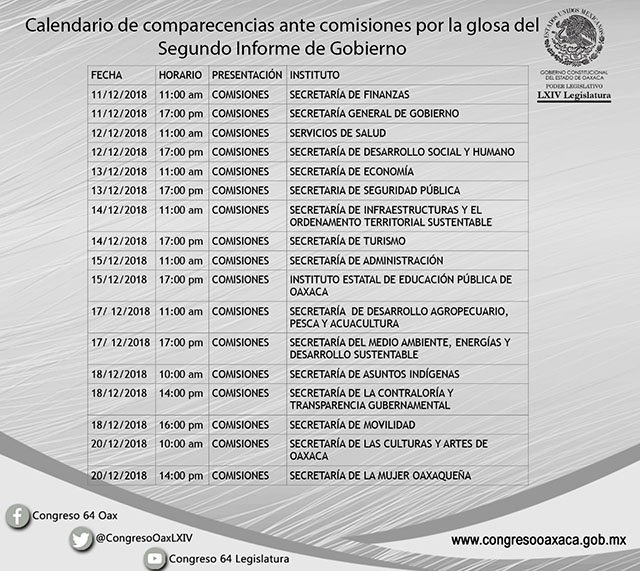 San Raymundo Jalpan, Oax.- La LXIV Legislatura del Congreso del Estado aprobó la mañana de este domingo, el calendario de comparecencias de los secretarios estatales para que rindan cuentas, a partir del próximo martes, de sus responsabilidades públicas en el marco del II Informe de Gobierno.