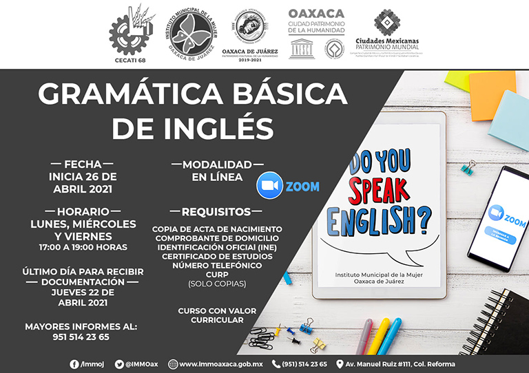 Oaxaca de Juárez, Oaxaca, a 20 de abril de 2021.- El Ayuntamiento de Oaxaca de Juárez, a través del Instituto Municipal de la Mujer, invita a las mujeres capitalinas a participar en el curso virtual gratuito de “Gramática básica de inglés”, que se impartirá del 26 de abril al 11 de junio de 2021, los lunes, miércoles y viernes, en un horario de 17:00 a 19:00 horas.