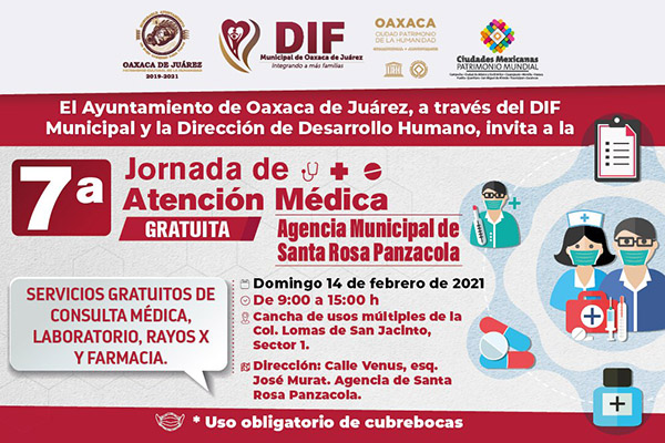 Oaxaca de Juárez, Oaxaca, a 9 de febrero de 2021.- Privilegiando el cuidado y la atención a la salud durante la pandemia de COVID-19, el Ayuntamiento de Oaxaca de Juárez, a través del DIF Municipal y la Dirección de Desarrollo Humano, invita a la ciudadanía a la Séptima Jornada de Atención Médica Gratuita que se realizará el próximo domingo 14 de febrero en la agencia de Santa Rosa Panzacola.