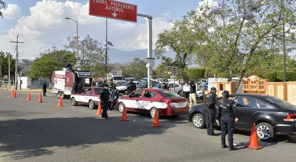 Los puntos donde se ubican estos filtros de contención en el primer día son la carretera federal 190, a la altura de La Joya; puente de San Jacinto Amilpas, crucero de Plaza Bella, carretera a Santa Cruz Xoxocotlán, frente a un conocido centro comercial; avenida Símbolos Patrios, a la altura de la gasolinería; avenida Ferrocarril, frente a las instalaciones de la Policía Vial Estatal; Camino Nacional esquina 5 de Febrero y el crucero de Santa María Ixcotel.