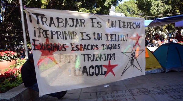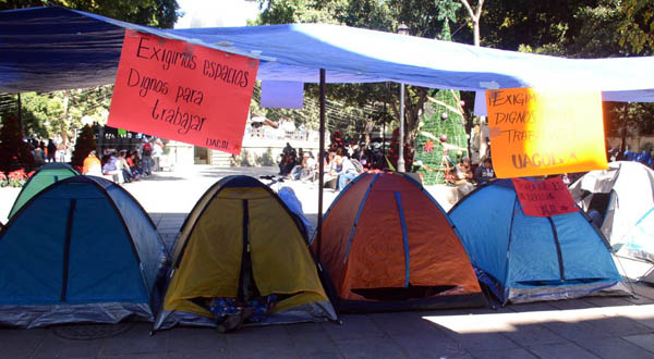 De nueva cuenta y dada la cercanía del período vacacional de fin de año, ADÁN MEJÍA, dirigente del membrete denominado Unión de Artesanos y Comerciantes Oaxaqueños en Lucha (UACOL), que formó durante los largos plantones fantasmas que ha instalado en el zócalo de la capital, el Cártel-22, en años anteriores, vuelve a las andadas. MEJÍA, que fue detenido hace poco más de dos años como responsable de haber dañado el equipo de cámaras fotográficas del C-4, de la Secretaría de Seguridad Pública estatal, salió del Penal de Santa María Ixcotel, sin que nadie le haya fincado responsabilidades pecuniarias, sino más bien producto de las negociaciones y acuerdos debajo de la mesa, que se hicieron famosas en el gobierno de GABINO CUÉ, pero siguen en las mismas en el de ALEJANDRO MURAT HINOJOSA.