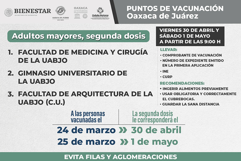 Oaxaca de Juárez, Oaxaca, a 28 de abril de 2021.- El Presidente Municipal, Oswaldo García Jarquín, anunció que, en coadyuvancia con la Delegación de Programas para el Desarrollo en el Estado de Oaxaca, este viernes 30 de abril y sábado 1 de mayo se realizará la aplicación de la segunda dosis de la vacuna contra la COVID-19 a las personas adultas mayores que recibieron el biológico el pasado 24 y 25 de marzo, con lo que concluirá con el cuadro básico de inmunización contra el SARS-CoV-2 para este importante sector poblacional.