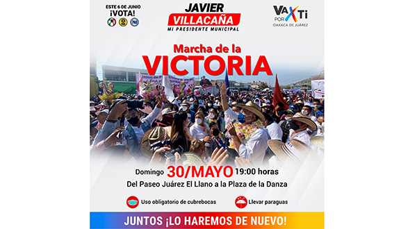 A siete días de la realización de la jornada electoral, donde las y los oaxaqueños elegirán presidentes municipales, diputados federales y locales, informó que con la presencia del dirigente nacional del Partido Revolucionario Institucional, Alejandro Moreno Cárdenas, realizará la “Marcha de la Victoria”, partiendo del Paseo Juárez el Llano con destino a la emblemática Plaza de la Danza, actividad a celebrarse este 30 de mayo a partir de las 19 horas.