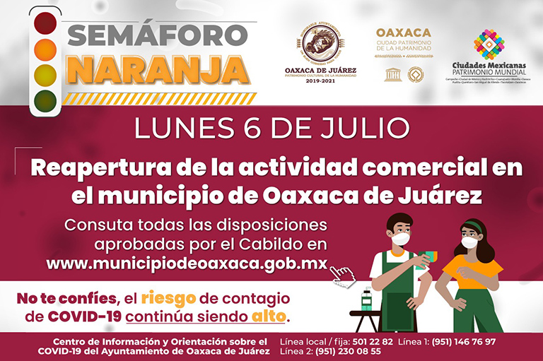 - Reiniciarán operaciones con base en el Esquema de reapertura de actividades económicas por nivel de riesgo epidemiológico y en estricto apego a los Lineamientos técnicos específicos para la reapertura de la actividad comercial en el Municipio de Oaxaca de Juárez.