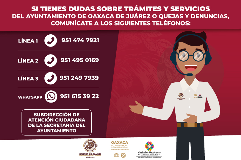 Explicó que, para dotar de un sistema de atención más eficiente y con un tiempo de respuesta más inmediata, las y los capitalinos pueden acceder a diferentes alternativas de asistencia, tales como las líneas telefónicas de apoyo con los números 951 474 79 21, 951 495 01 69, 951 249 79 39 y 951 615 39 22 (WhatsApp), las cuales se mantienen activas las 24 horas de los siete días de la semana para atender los requerimientos de las personas, estableciendo vínculos entre las dependencias municipales y la ciudadanía.