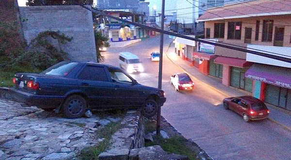 Un coche tipo Tsuru quedó a escasos centímetros de caer al vacío sobre la calle 9a sur del Barrio del Puente de Pinotepa Nacional.