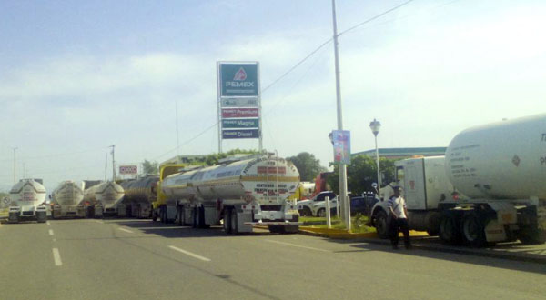 SALINA CRUZ, Oax. Veinte autotanques que distribuyen productos petrolíferos de Petróleos Mexicanos, permanecen desde hace 72 horas varados en el bloqueo que realizan los maestros de la Sección 22 y padres de familia en el tramo carretero Salina Cruz a Tehuantepec. Lo anterior representa un riesgo por la acumulación de gases que Protección Civil consideró de alto riesgo.