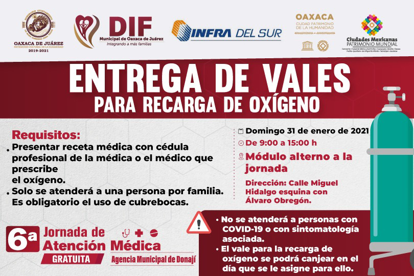 El domingo 31 de enero, durante la Sexta Jornada de Atención Médica Gratuita en la cancha de básquetbol de la agencia de Donají, donde se desarrollará esta actividad, se colocará un módulo alterno para recibir solicitudes de dotación de oxígeno y entrega de vales a quien así lo requiera.