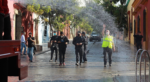 Apoyados con vehículos tipo pipa, los elementos del Cuerpo de Bomberos de Oaxaca recorrieron toda la calle de Alcalá, desde Berriozábal hasta la avenida Independencia, así como algunas de las intersecciones donde están ubicados los filtros de control preventivo del Operativo “Alfa”.