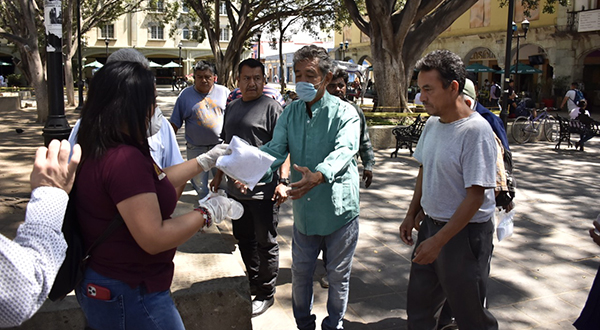 Oaxaca de Juárez, Oaxaca, a 2 de abril de 2020.- Para reforzar las medidas sanitarias contra el COVID-19 en el primer cuadro de la ciudad, el Ayuntamiento de Oaxaca de Juárez, a través de la Coordinación Ejecutiva del Centro Histórico, entregó insumos sanitarios a 50 aseadores de calzado que laboran en la Alameda de León y el Zócalo capitalino, a fin de mantener sus áreas de trabajo limpias y brindar un servicio de calidad a la ciudadanía.