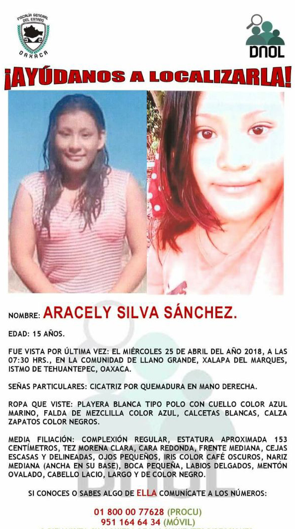 En lo que corresponde a la otra joven de 15 años de edad de nombre Aracely Silva Sánchez, también misteriosamente desapareció a las 10:30 horas en la agencia de Rancho Grande, también perteneciente a Santa María Jalapa del Marqués.