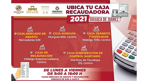 Oaxaca de Juárez, Oaxaca, a 6 de septiembre de 2021.- Para continuar facilitando a la ciudadanía el pago de sus contribuciones municipales, el Ayuntamiento de Oaxaca de Juárez, a través de la Tesorería Municipal, sigue poniendo a disposición cinco Cajas Recaudadoras que ofrecen puntual atención, cumpliendo cabalmente las disposiciones sanitarias para cuidar la salud de la ciudadanía.