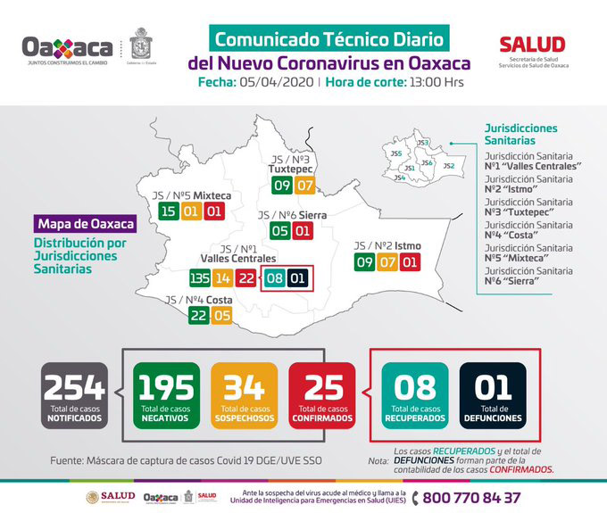De los 25 casos confirmados por Covid-19: 22 de ellos en Valles Centrales, 01 a la Mixteca, 01 a la Sierra Norte y 01 al Istmo. Una defunción.