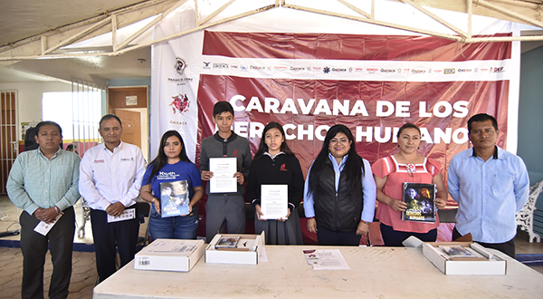 Por último, las y los miembros del presídium hicieron entrega de un kit que contiene una guía del educador, una película sobre los Derechos Humanos, trípticos y carteles con información de interés; en ese contexto, los alumnos del COBAO, Briseida Vásquez y Antonio García Arango, realizaron la firma simbólica como integrantes de “Jóvenes por los Derechos Humanos”.