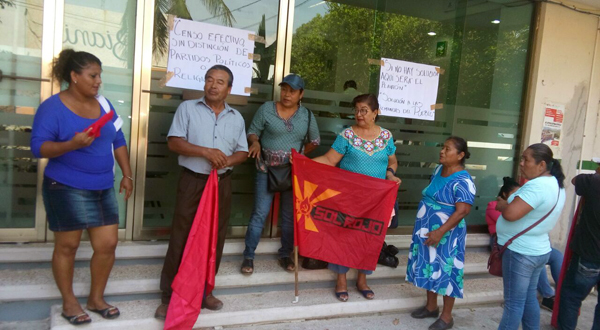 SALINA CRUZ. Militantes de la organización Sol Rojo se manifestaron en las oficinas que ocupa el Sistema de Administración Tributaria para exigir la reconstrucción de viviendas y se frene el aumento de los principales insumos que laceran la economía.