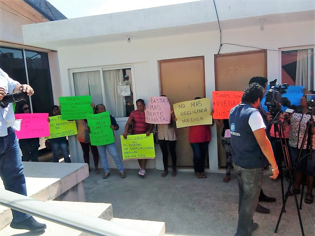 SALINA CRUZ, OAX. Familiares y vecinos de la señora Piedad Zarate quien perdió a su bebé en el vientre por una presunta negligencia médica en el Hospital con Especialidad, se manifestaron en la Fiscalía de la Agencia del Ministerio Público para exigir se integre el legajo correspondiente para investigar a los médicos de ese nosocomio.