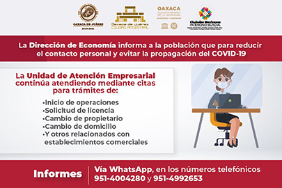 Oaxaca de Juárez, Oaxaca, a 14 de julio de 2021.- Cuidando la salud de la ciudadanía interesada en realizar trámites de tipo comercial, el Ayuntamiento de Oaxaca de Juárez pone a disposición de la ciudadanía en los números de WhatsApp 951 400 42 80 y 951 499 2653 para agendar citas referentes a trámites en la Unidad de Atención Empresarial de la Dirección de Economía.