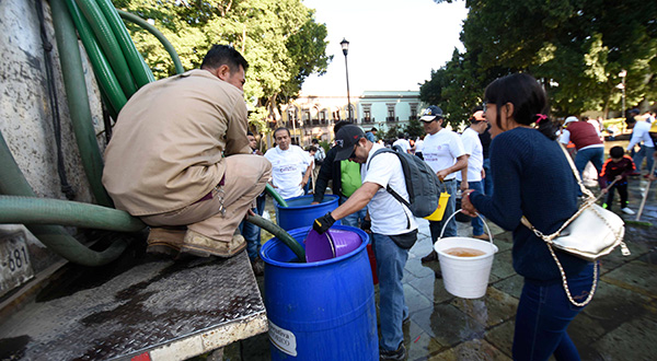 En este tequio se emplearon los tres vehículos que en días pasados el edil Oswaldo García Jarquín entregó a la Coordinación Ejecutiva del Centro Histórico, mismos que apoyaron en los trabajos de lavado de la cantera en la Catedral Metropolitana y las demás zonas.
