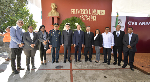 En el Jardín Madero, en representación del Presidente Municipal, Oswaldo García Jarquín, el Síndico Hacendario, Jorge Castro Campos, acompañado del secretario de Turismo del Estado, Juan Carlos Rivera Castellanos Rivera, representante del Gobernador Alejandro Murat Hinojosa, así como del representante de la Octava Región Militar, el General de Brigada Miguel Aranda Gutiérrez y el representante del Tribunal Superior de Justicia de Oaxaca, magistrado José Luis Reyes Hernández, montaron una guardia de honor y depositaron una ofrenda floral para distinguir al héroe de la revolución mexicana.