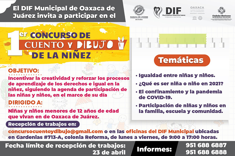 Oaxaca de Juárez, Oaxaca, a 10 de abril de 2021.- Para incentivar la creatividad y reforzar los procesos educativos y de aprendizaje de los derechos e igualdad en la niñez, siguiendo la agenda de participación de las niñas y niños, el Ayuntamiento de Oaxaca de Juárez, a través del DIF Municipal, reitera la invitación a la niñez a participar en el Primer Concurso Municipal “Cuento y Dibujo de la Niñez”.