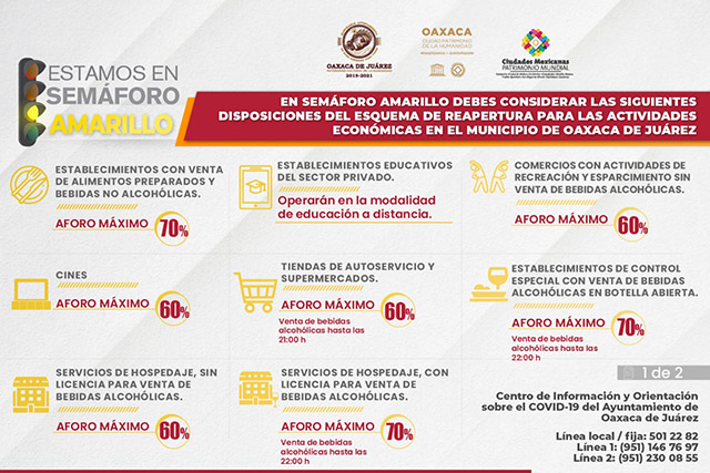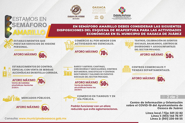 Este esquema establece que, en semáforo amarillo, los establecimientos con giros de venta de alimentos preparados y bebidas no alcohólicas, pueden funcionar con un aforo máximo del 70 por ciento. En tanto que bares y antros, así como aquellos con licencias de cantinas, cervecerías, mezcalerías, centros botaneros, discotecas, centros nocturnos y salones de eventos sociales del sector privado podrán funcionar con un aforo máximo del 50 por ciento, el horario para la venta y consumo de bebidas alcohólicas se restringe hasta las 24:00 horas y con estricto apego a los Lineamientos técnicos específicos para la reapertura de la actividad comercial en el municipio de Oaxaca de Juárez.