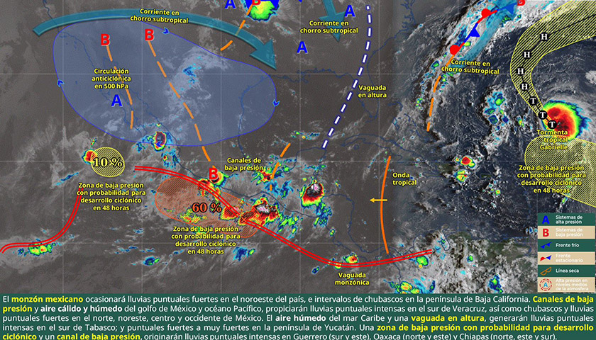 Lo anterior, debido a una zona de baja presión con alta probabilidad de desarrollo ciclónico frente a la costa de Guerrero, inmersa en la vaguada monzónica que seguirá impulsando un fuerte flujo de humedad hacia el interior de la entidad.