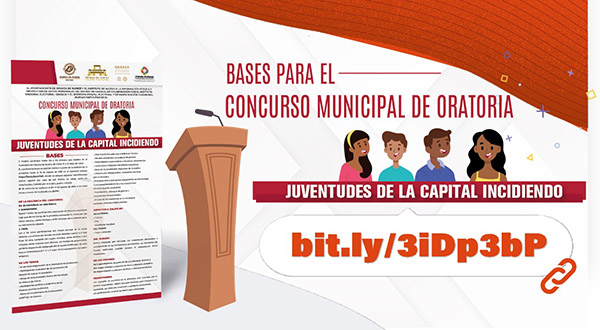 Oaxaca de Juárez, Oaxaca, a 12 de agosto de 2021.- El Ayuntamiento de Oaxaca de Juárez, a través de la Dirección de Desarrollo Humano, y en coordinación con el Instituto de Acceso a la Información Pública y Protección de Datos Personales del Estado de Oaxaca, en colaboración con el Instituto Nacional Electoral (INE-Oaxaca) y el Instituto Estatal Electoral y de Participación Ciudadana de Oaxaca (IEEPO), invita a las y los jóvenes de entre 15 a 29 años de edad, que residan en la ciudad capital, a participar en el Concurso Municipal de Oratoria “Juventudes de la capital incidiendo”.