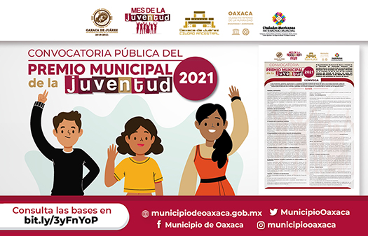 Oaxaca de Juárez, Oaxaca, a 8 de julio de 2021.- El Ayuntamiento de Oaxaca de Juárez, a través de la Dirección de Desarrollo Humano, convoca a las y los jóvenes de la capital colectivos, organizaciones y asociaciones juveniles residentes de Oaxaca de Juárez, a participar en el Premio Municipal de la Juventud 2021 para reconocer su trabajo de ejemplo, cultura de esfuerzo, responsabilidad social, desempeño académico, científico, fomento a la cultura, compromiso humanitario, defensa de los derechos y acciones para el desarrollo de la sociedad.