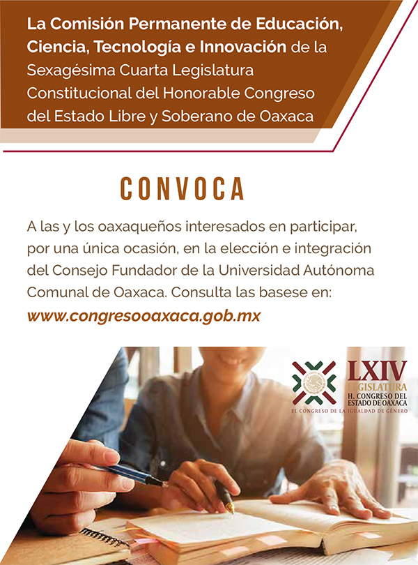 San Raymundo Jalpan, Oax. 07 de julio de 2020.- La Comisión de Educación, Ciencia, Tecnología e Innovación de la LXIV Legislatura del Congreso de Oaxaca, emitió la convocatoria pública para integrar al Consejo Fundador de la Universidad Autónoma Comunal de Oaxaca.