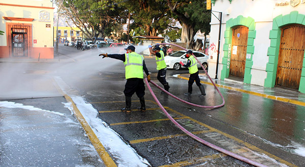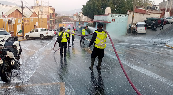 En tanto, el Director del Heroico Cuerpo de Bomberos del Gobierno del Estado, Juan Manuel Maza Sánchez, comentó que “a petición de la autoridad municipal, en coordinación con las policías Estatal y Vial estamos llevando a cabo esta aplicación de desinfectante, jabón y cloro, con la misión de controlar la propagación del virus en estas zonas; seguimos pidiéndole a la ciudadanía que se mantenga en sus casas y en caso de salir a actividades esenciales, lo hagan cumpliendo con las medidas sanitarias correspondientes”.