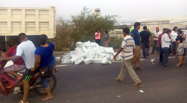 Al momento en que automovilistas que circulaban por la carretera, se percataron que había amontonado papel higiénico, leche y otros productos de la canasta básica, comenzaron con la rapiña para llevarse todo lo que pudieron.
