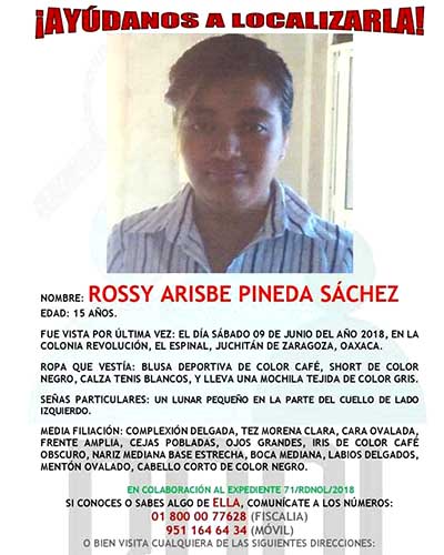 Se trata de Rossy Arisbe Pineda Sánchez quien desapareció el pasado 9 de junio quien fue vista por última vez en la colonia Revolución del municipio de El Espinal.