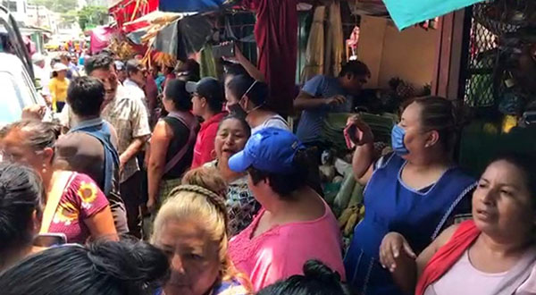 Por varios minutos se observa en calles aledañas al mercado Ignacio Zaragoza, la corredera de policías y comerciantes y en medio de esto se logró liberar a la directora de mercados.