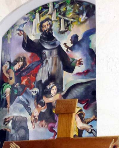 También se muestran los Ángeles que bajaban con su música; la imagen del personaje que no creía en San Francisco y la flora que representa a la región con la flor de toloache, mientras que en la mano San Francisco lleva al Espíritu Santo.