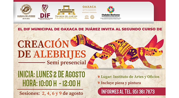 Oaxaca de Juárez, Oaxaca, a 30 de julio de 2021.- Con el fin de seguir estimulando la imaginación y creatividad, así como para preservar la multiculturalidad de los Valles Centrales, el DIF Municipal de Oaxaca de Juárez, a través del Instituto de Artes y Oficios, en colaboración con el Estudio de Arte “Luz de Luna”, invita a las y los capitalinos a participar en el segundo taller semipresencial de “Creación de Alebrijes”, que se realizará los días 2, 4, 6 y 9 de agosto, con las medidas sanitarias correspondientes.