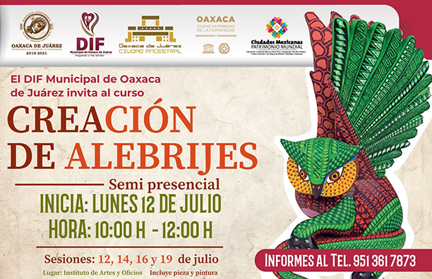 Oaxaca de Juárez, Oaxaca, a 6 de julio de 2021.- Para estimular y favorecer la imaginación y creatividad, así como para preservar la multiculturalidad de los Valles Centrales, el DIF Municipal de Oaxaca de Juárez, a través del Instituto de Artes y Oficios en colaboración con el Estudio de Arte Luz de Luna, invita a participar en el taller semipresencial de “Creación de Alebrijes”, que se realizará los días 12, 14, 16 y 19 de julio.