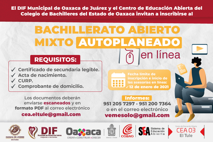 Oaxaca de Juárez, Oaxaca, a 8 de enero de 2021.- El DIF Municipal de Oaxaca de Juárez y el Centro de Educación Abierta del Colegio de Bachilleres del Estado de Oaxaca (COBAO) invitan a las y los capitalinos que deseen iniciar o continuar sus estudios de nivel medio superior, a inscribirse en la modalidad de Bachillerato Abierto Mixto Autoplaneado, que ante la contingencia sanitaria por COVID-19 se desarrollará en la modalidad en línea. La fecha límite de inscripción es el 12 de enero.