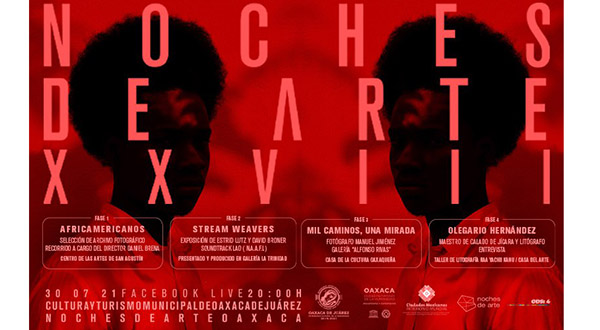 Oaxaca de Juárez, Oaxaca, a 30 de julio de 2021.- El Ayuntamiento de Oaxaca de Juárez, a través de la Dirección de Cultura y Turismo, invita a la ciudadanía a la vigésima octava edición de “Noches de Arte” que se llevará a cabo de manera virtual y se difundirá a través de www.facebook.com/CulturayTurismoOaxaca.