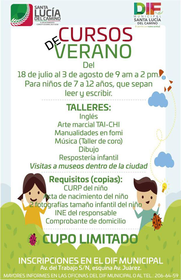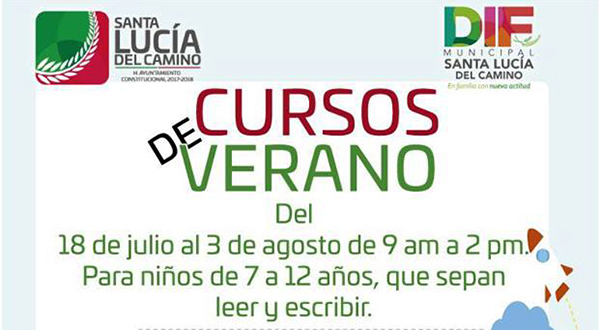 Será durante este periodo vacacional, que el Gobierno Municipal de Santa Lucía del Camino que encabeza Raúl Cruz González, en conjunto con la Presidenta Honoraria del Sistema DIF Municipal Leticia Cruz Regino, llevarán a cabo sus “Cursos de Verano” del 18 de Julio al 03 de Agosto, en un horario de 09:00 a 14:00 Hrs, para niños de 7 a 12 años, mismos que se realizarán en la Casa de la Cultura Municipal.