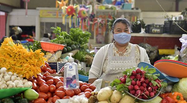 - La Subdirección de Mercados dota de insumos sanitarios como cubrebocas, gel antibacterial, jabón líquido y cloro a las y los locatarios de 14 mercados y dos espacios públicos municipalizados.