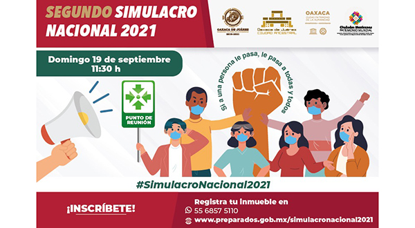 Oaxaca de Juárez, Oaxaca, a 25 de agosto de 2021.- Con el propósito de fomentar una cultura de la prevención y contribuir al fortalecimiento de las capacidades de reacción ante una emergencia o fenómeno perturbador, el Ayuntamiento de Oaxaca de Juárez, a través de la Subdirección de Protección Civil, invita a la población a participar en el Segundo Simulacro Nacional 2021.