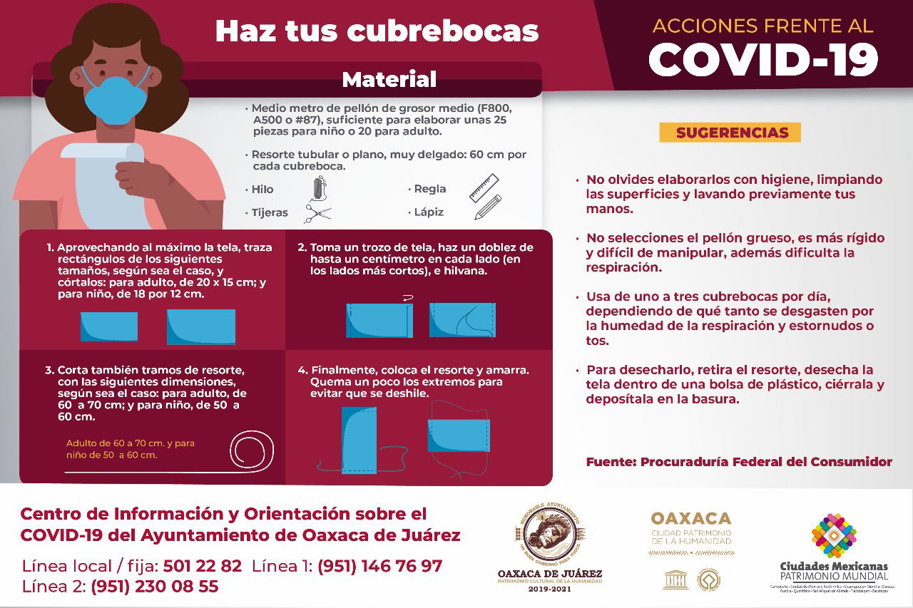 Oaxaca de Juárez, Oaxaca a 24 de abril de 2020.- Ahora que en México ha comenzado la Fase 3 de la pandemia por COVID-19, es necesario incrementar y reforzar las medidas de prevención para evitar la propagación del coronavirus, por ello el Ayuntamiento de Oaxaca de Juárez te exhorta a elaborar tu cubrebocas en casa y cumplir con la disposición del Gobierno del Estado de usar de forma obligatoria este artículo en espacios y transporte públicos.