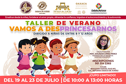 Oaxaca de Juárez, Oaxaca, a 14 de julio de 2021.- Abriendo espacios formativos que incorporan la igualdad y refuerzan la perspectiva de género en la niñez, el Ayuntamiento de Oaxaca de Juárez, a través del Instituto Municipal de la Mujer, invita a niñas de la ciudad capital, de 8 a 12 años de edad, a inscribirse y participar en el taller de verano “Vamos a desprincesarnos”, que será impartido por la psicóloga Soledad López Pérez.