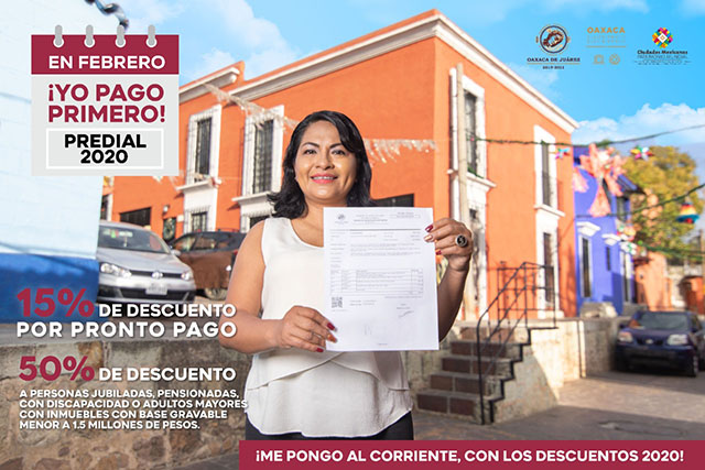 Oaxaca de Juárez, Oaxaca, a 4 de febrero del 2020.- La Tesorería Municipal del Ayuntamiento de Oaxaca de Juárez invita a las y los contribuyentes a acudir a cualquiera de los cinco módulos de recaudación con los que cuenta el Gobierno Municipal para realizar el pago de impuestos municipales y, con ello, aprovechar los descuentos que durante el mes de febrero continúan vigentes.