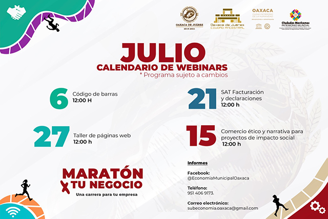 Oaxaca de Juárez, Oaxaca, a 2 de julio de 2021.- El Ayuntamiento de Oaxaca de Juárez, a través de la Dirección de Economía, continúa organizando espacios virtuales de aprendizaje. Del 6 al 27 de julio llevará a cabo los webinars de formación empresarial y fomento emprendedor “Maratón x tu negocio”.
