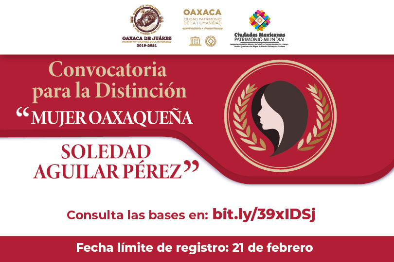 Oaxaca de Juárez, Oaxaca, a 20 de febrero de 2021.- El Ayuntamiento de Oaxaca de Juárez recuerda a la ciudanía que este domingo 21 de febrero cierra la convocatoria para postular a mujeres a que reciban la Distinción “Mujer Oaxaqueña Soledad Aguilar Pérez”, que tiene la premisa de reconocer a aquellas mujeres que han realizado un aporte para la transformación personal y social y sean ejemplo para las nuevas generaciones.