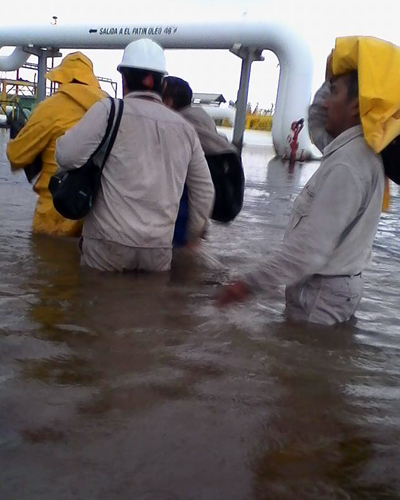 Aunque en algunas zonas que conforma el perímetro en donde se encuentran ubicados las 26 plantas que procesan los productos petrolíferos, el agua alcanzó un metro de altura y aun así en esas condiciones algunos petroleros tuvieron que cumplir con su jornada laboral.