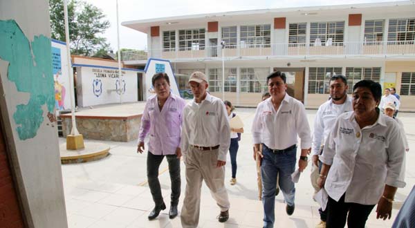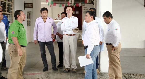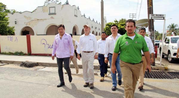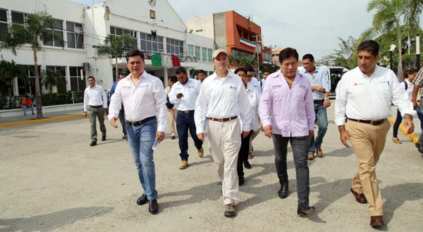El Presidente municipal Rodolfo León Aragón, el Director General de Petróleos Mexicanos Pemex. Dr. José Antonio González Anaya y el Secretario de Turismo Mtro. Juan Carlos Rivera Castellanos, evalúan los daños en viviendas, edificios públicos e instituciones educativas en Salina Cruz.