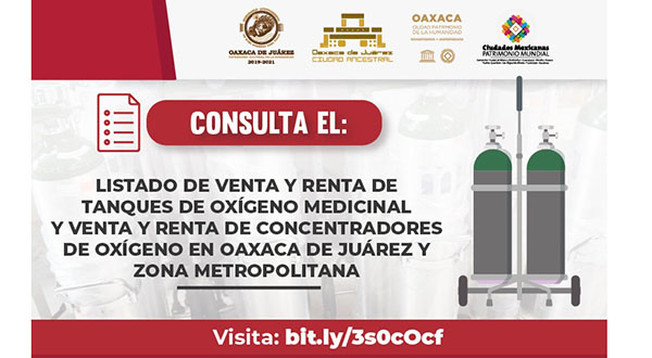 Oaxaca de Juárez, Oaxaca, a 18 de agosto de 2021.- El Ayuntamiento de Oaxaca de Juárez, a través de la Regiduría de Salud, Sanidad y Asistencia Social, pone a disposición de la ciudadanía el “Listado corroborado de venta y renta de tanques de oxígeno medicinal / venta y renta de concentradores de oxígeno en el municipio de Oaxaca de Juárez y zona metropolitana”, con la intención de brindar información que ayude a la población a enfrentar complicaciones de salud causa del COVID-19.