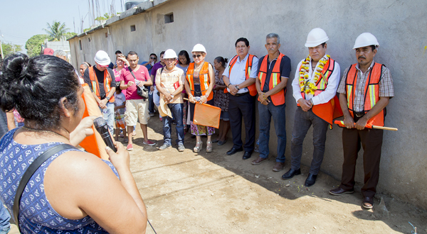 Salina Cruz, Oaxaca. 06 de noviembre 2017. Con el fin de fortalecer la infraestructura urbana con obras que dignifiquen a las familias, el Presidente Municipal Rodolfo León Aragón, dio el banderazo de inicio de obra de 3,472 metros cuadrados de pavimentación con concreto hidráulico de la calle girasoles y calle Ceibas de la colonia Chapultepec.